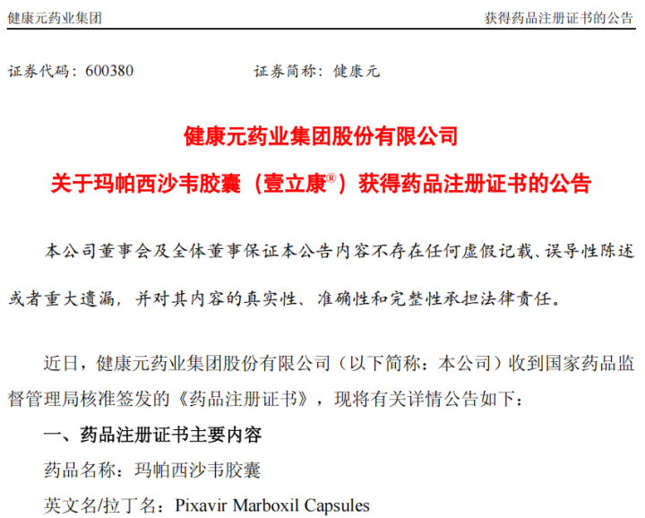 2025年12月11日,健康元药业集团旗下1类创新药玛帕西沙韦胶囊(壹立康®)正式获批上市。作为国内创新采用“一次口服完成全疗程”的新型帽依赖性核酸内切酶抑制剂,该药物以机制创新、依从性突破与广谱疗效,为12岁及以上青少年和成人甲型、乙型流感患者带来全新治疗选择。